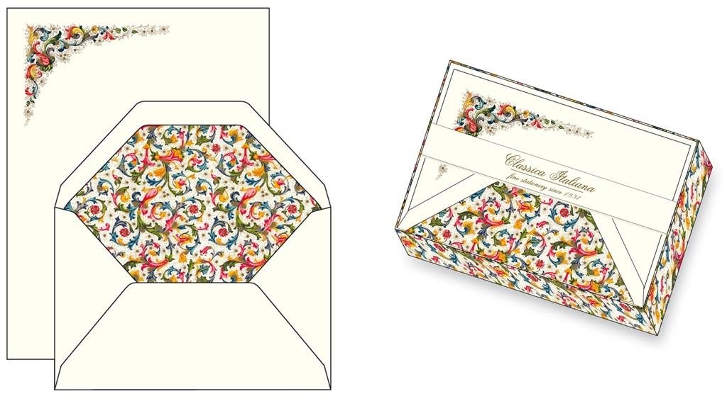 Papeteria w ozdobnym pudełku z przykrywką, koperty posiadają zaznaczoną linię, papier bawełniany o gramaturze 120g/m2. W zestawie znajduje się 10 kopert i 10 papierów listowych. Produkt z ekskluzywnej galanterii wyprodukowany we włoskiej manufakturze. przeczytaj całość