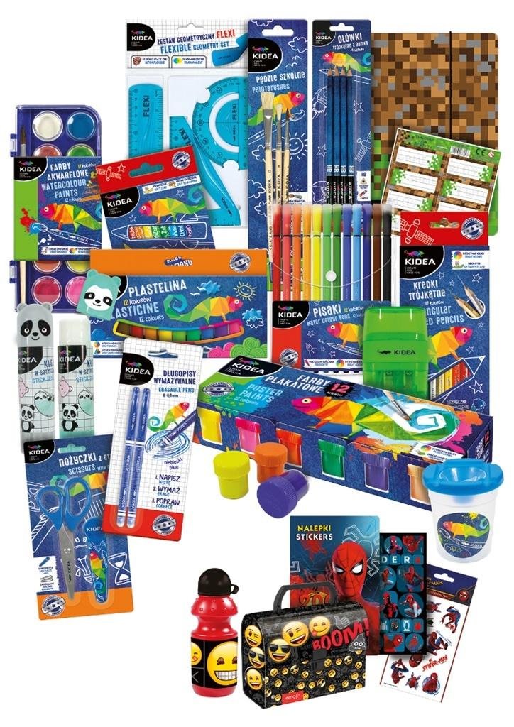 Ta wyprawka szkolna to niezbędnik każdego chłopca! Cały zestaw zawiera, ponad 300 elementów! Znajdziesz w nim wszystkie potrzebne przybory szkolne. W zestawie znajdują się: kredki trójkątne, farby plakatowe, pisaki, temperówka, plastelina, kubeczek do farb, dwa kleje, farby akwarelowe, kredki...