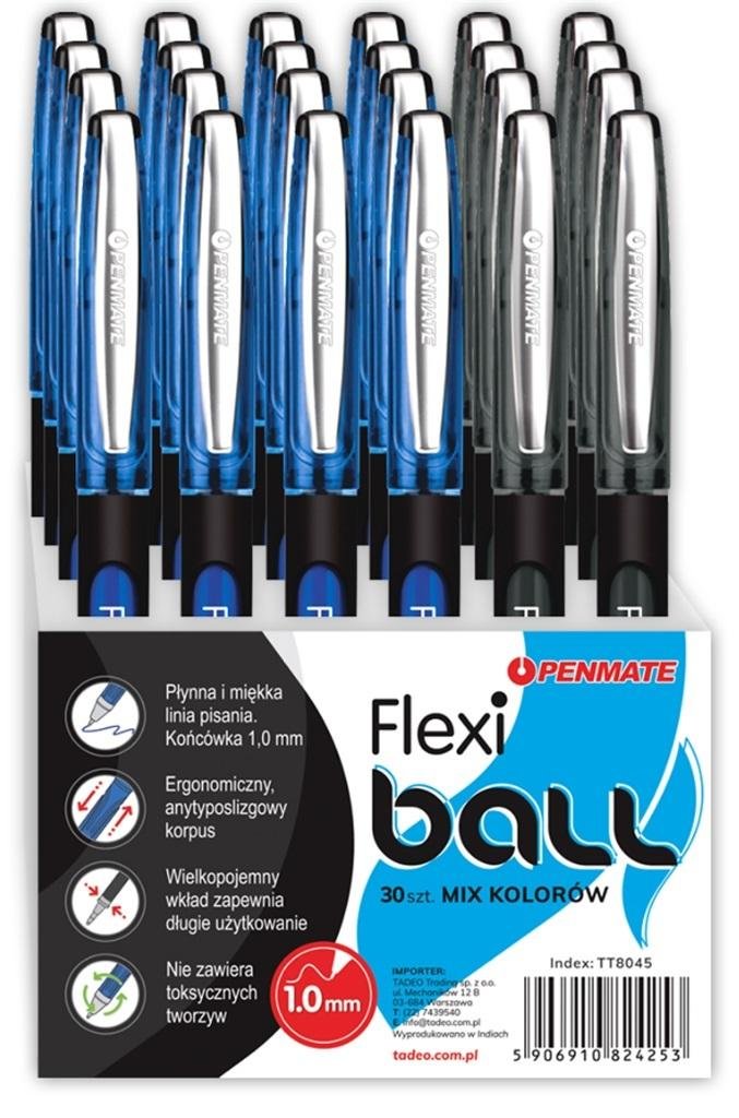 Opakowanie zbiorcze 30 sztuk,Mix w opakowaniu zbiorczym. Końcówka kulkowa 1.0 mm. Wymienny, wielkopojemny wkład zapewnia długość lini pisania 2500m Ergonomiczny, antypoślizgowy korpuis zapewnia komfor użycia. Płynna i miękka linia pisania. Nie zawiera toksycznych tworzyw. przeczytaj całość