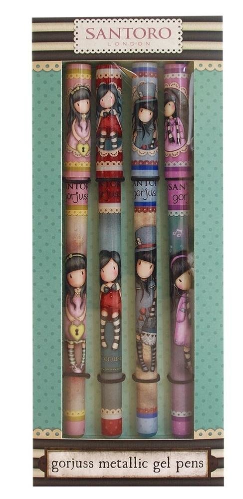 Zestaw czterech metalicznych długopisów żelowych. Bardzo ciekawy zestaw 4 metalowych długopisów żelowych ze skuwką. Można skompletować je z piórnikami z kolekcji Gorjuss. Kolory wkładów: złoty, srebrny, fioletowy i niebieski. Można je wymieniać. przeczytaj całość