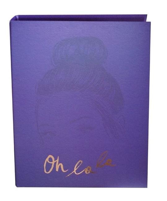 Segregator w formacie A4, koloru fioletowego z motywem dziewczyny oraz złotym napisem Oh la la. przeczytaj całość