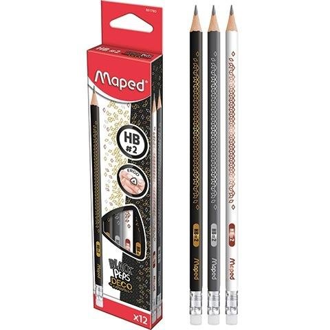 Olówki Black'Peps DECO z gumka. Twardosc HB. Wykonane z drewna lipowego. Trójkatny przekrój. Grafit odporny na zlamania. Dostepne w 3 wersjach kolorystycznych - czarne, biale i szare z wzorami w metalicznych kolorach. W pudelku miks 3 wzorów. 12 sztuk w opakowaniu przeczytaj całość