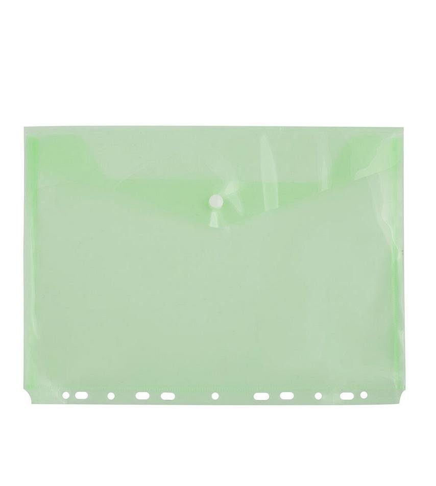 klasyczna teczka kopertowa z uniwersalną perforacją umożliwiająca wpięcie do każdego typu segregatora- rozmiar A4- wykonana z folii PP- zamykana na zatrzask- transparentna zielona przeczytaj całość