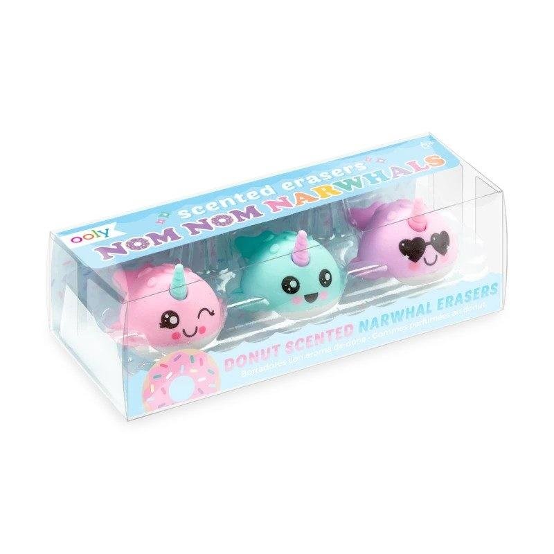 Trzy uśmiechnięte Narwala Ooly Nom Nom z wymiennymi rogami to pachnące pączkami gumki do ścierania ołówka.Wesołe gumki pachnące słodkimi pączkami to idealne towarzystwo do szkoły. Wprowadzą nieco koloru a nawet wakacyjnych klimatów. Niezastąpione, gdy trzeba wymazać błędy i gryzmoły...