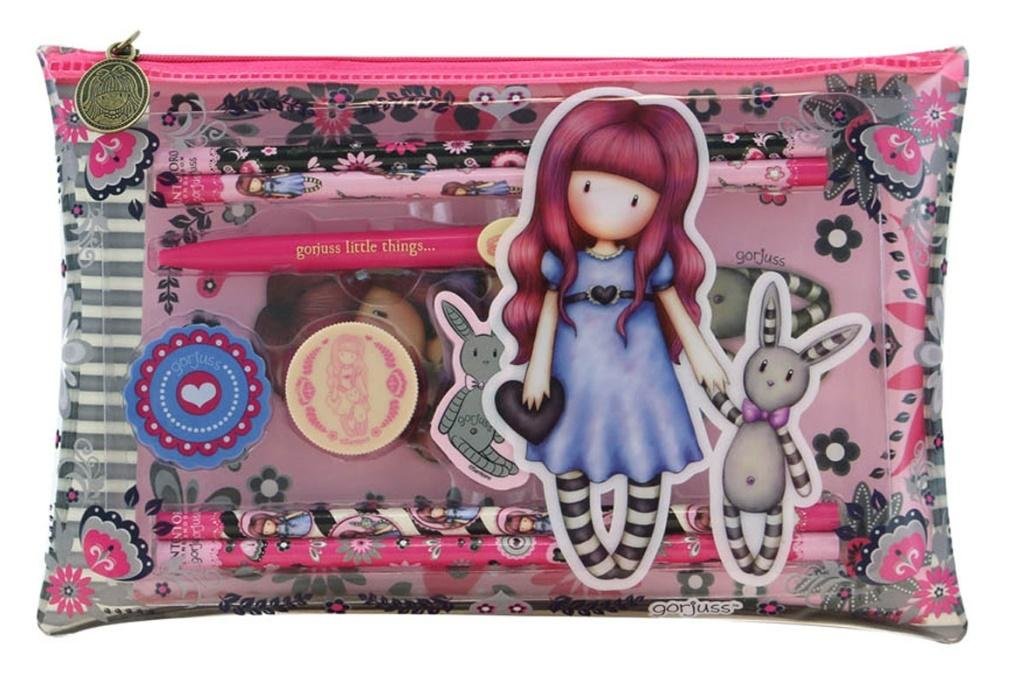 Zestaw przyborów szkolnych zapakowanych w gustowną kosmetyczkę zapinaną na suwak. Zawiera: długopis, 4 ołówki, dwie gumki i temperówkę. W zestawie również 30 kartkowy zeszyt. Wszystko ozdobione wizerunkiem dziewczynek Gorjuss. Bardzo słodki prezent na każdą okazję. przeczytaj całość