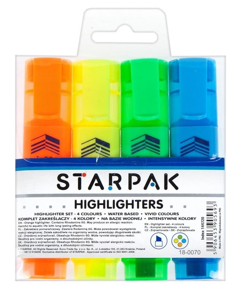 Zestaw zakreślaczy z kolekcji Starpak dedykowanej dla szkoły i biura. Tradycyjne zakreślacze na bazie wody w żywych i intensywnych kolorach. Ułatwiają zaznaczanie najważniejszych treści. Zapakowane w gumowe etui. W zestawie znajdują się zakreślacze w 4 kolorach: zółty, zielony, niebieski i...