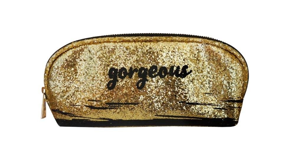 Piórnik saszetka.Zapinany na zamek.Kolor złoty.Brokatowy.Ozdobiony czrnym napisem "gorgeous". przeczytaj całość