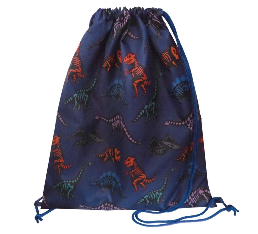 Worek na obuwie szkolne w kolorze niebieskim o motywem z dinozaurami. przeczytaj całość