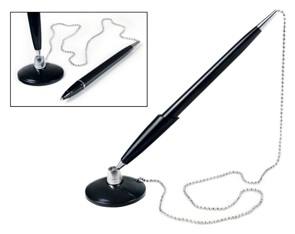 Elegancki długopis z wymiennym wkłademSamoprzylepna podstawaŁańcuszek o długości 57 cmLeżący lub stojacyNiebieski kolor wkładu przeczytaj całość