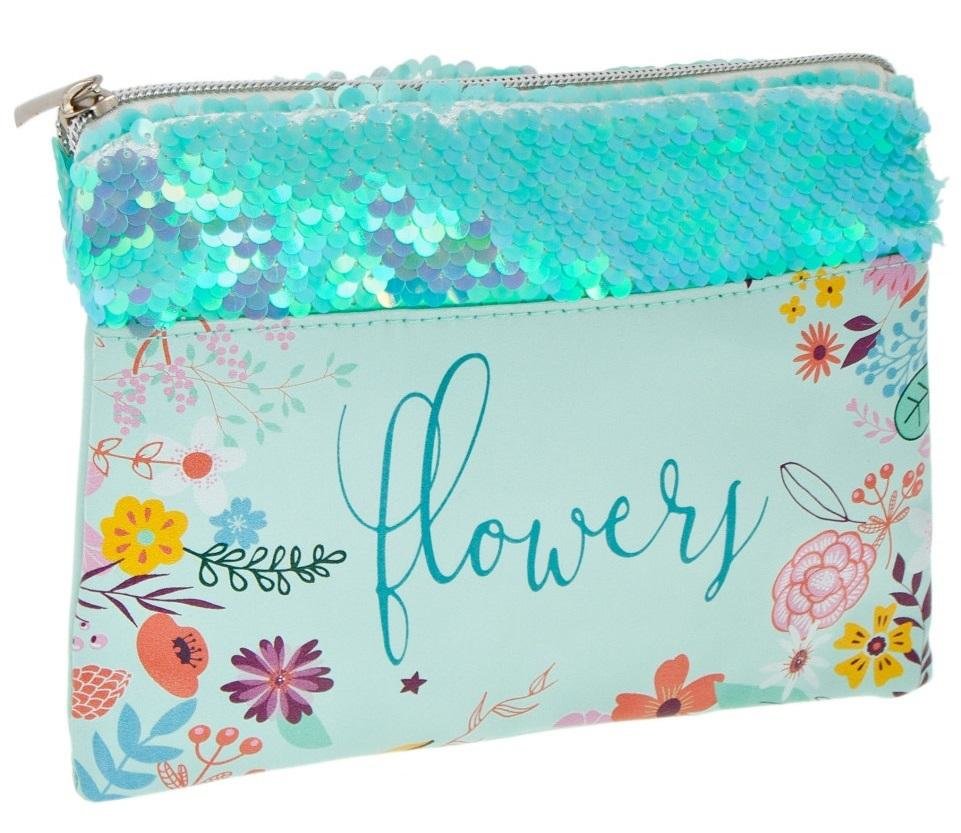 Piórnik w kształcie saszetki z zamkiem błyskawicznym. Pomieści niezbędne artykuły piśmiennicze i nie zajmie dużo miejsca w plecaku. Z kwiatowym nadrukiem i cekinami. Wymiary: 20 x 14 cm przeczytaj całość