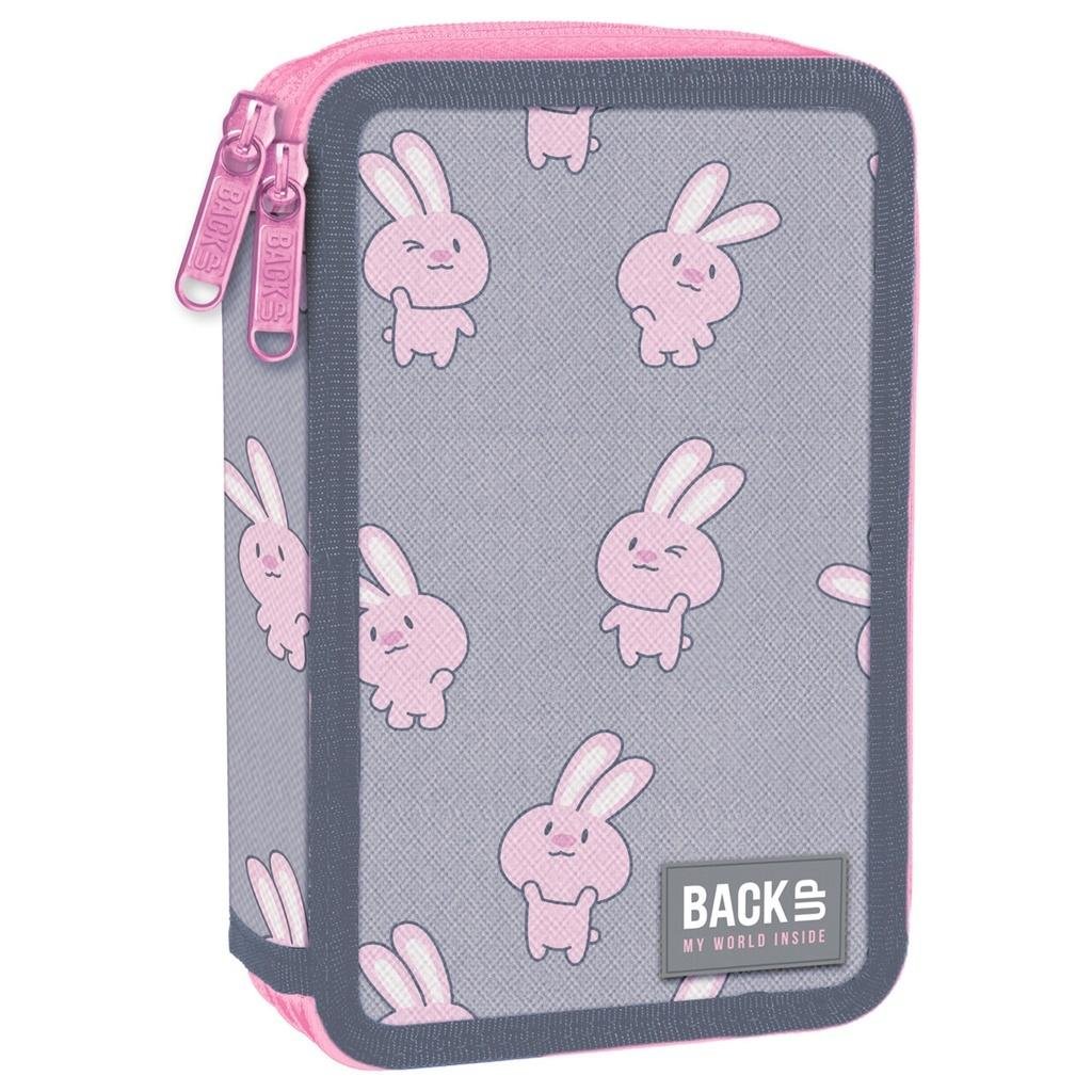 Dwukomorowy piórnik z wyposażeniem o popielatym kolorze, ozdobiony słodkimi, różowymi króliczkami. Łagodny róż i delikatna szarość to zawsze udane połączenie. Cudowne króliczki zauroczą każdą miłośniczkę futrzaków. Funkcjonalność i wyjątkowy wzór sprawią, że piórnik BackUP będzie towarzyszył Ci...