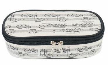 Praktyczny i zarazem elegancki kremowy piórnik w czarne pięciolinie i nutki, zapisany na zamek z dwóch stron, o wymiarach 21 x 10 x 6 cm. przeczytaj całość