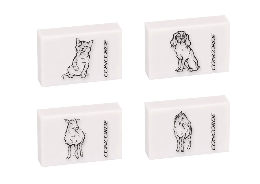 Bílá pryž o rozměrech 3,3 x 2,2 cm, dodávané v mixu 5 různých obrázků zvířátek - žába, kočka, pes, kůň, ovce. przeczytaj całość