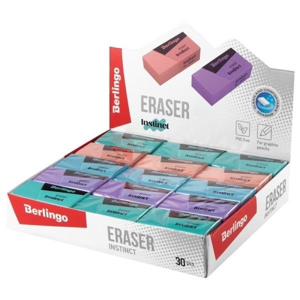 Opakowanie zbiorcze 30 sztuk.Gumka z kolekcji Berlingo "Instinct".Pastelowe kolory w połączeniu z czarnym: różowy, lawenda, mięta, akwamaryn.Gumki wykonane są z wysokiej jakości gumy termoplastycznej.Nietoksyczne, nie zawierają PVC i ftalanów.Doskonale radzić sobie z wymazywaniem linii po... przeczytaj całość