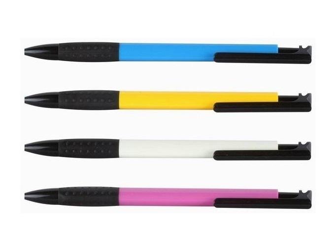 Plastikowy długopis, automatyczny, ergonomiczna obudowa z uchwytem antypoślizgowym, wymienny wkład F-411, niebieski kolor tuszu, grubość linii 0,7 mm, miks kolorów, 50 sztuk w paczce. przeczytaj całość