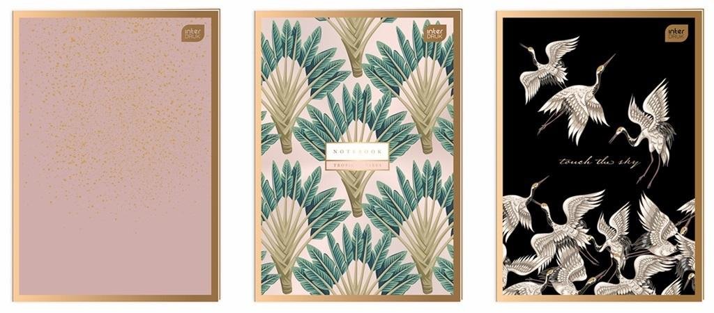 Opakowanie zbiorcze 5 sztuk.Format: A4. Liczba kartek: 60. Zadruk w linię. Okładka z efektem złotej matowej metalizy z modnym motywem natury lub z abstrakcyjnym wzorem. przeczytaj całość