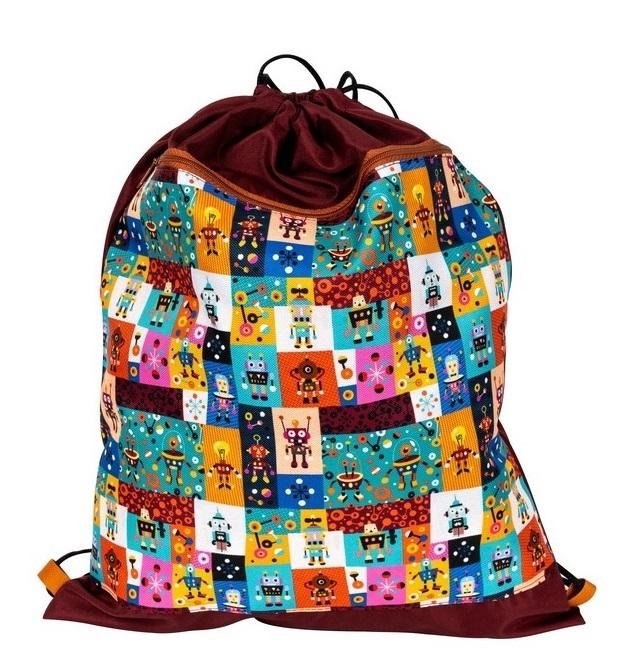 Tekstylna torba na kapcie ze ściągaczem, po odciągnięciu tworzy "ramiączka" - może służyć jako plecak, przednia kieszeń na zamek 27 x 33 cm, powierzchnia zadrukowana, rozmiar torby 34 x 43 cm przeczytaj całość