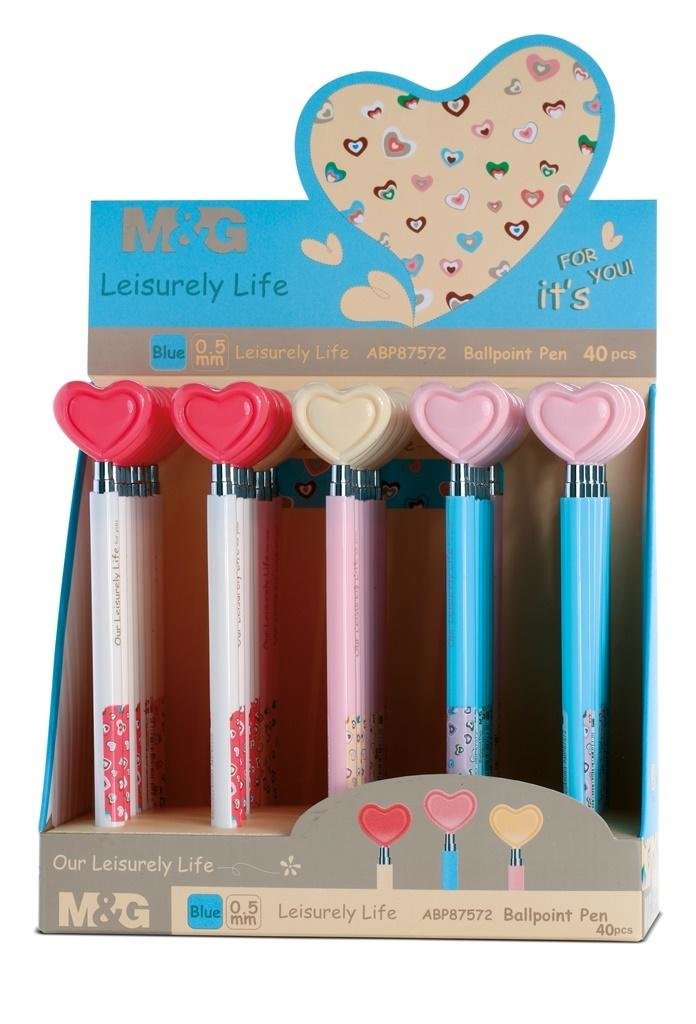 automatyczny- wymienny wkład w kolorze niebieskim- wytrzymała obudowa z ABS- szwajcarska końcówka- przycisk zakończony ozdobnym serduszkiem- pakowany w display po 40 sztuk, 3 kolory obudowy- grubość linii pisania: 0,5 mm przeczytaj całość
