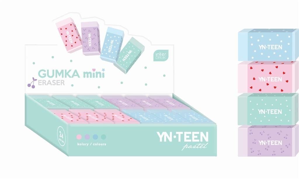 Opakowanie zbiorcze 24 sztuki.Dziewczęca gumka w poręcznym, małym rozmiarze i uroczym wzorze na owijce. Dostępna w 4 pastelowych kolorach: niebieskim, różowym, zielonym i fioletowym. Bardzo dobrze ściera, nie pozostawiając żadnych smug. 24 szt. w displayu. Poznaj nasze pozostałe pastelowe...