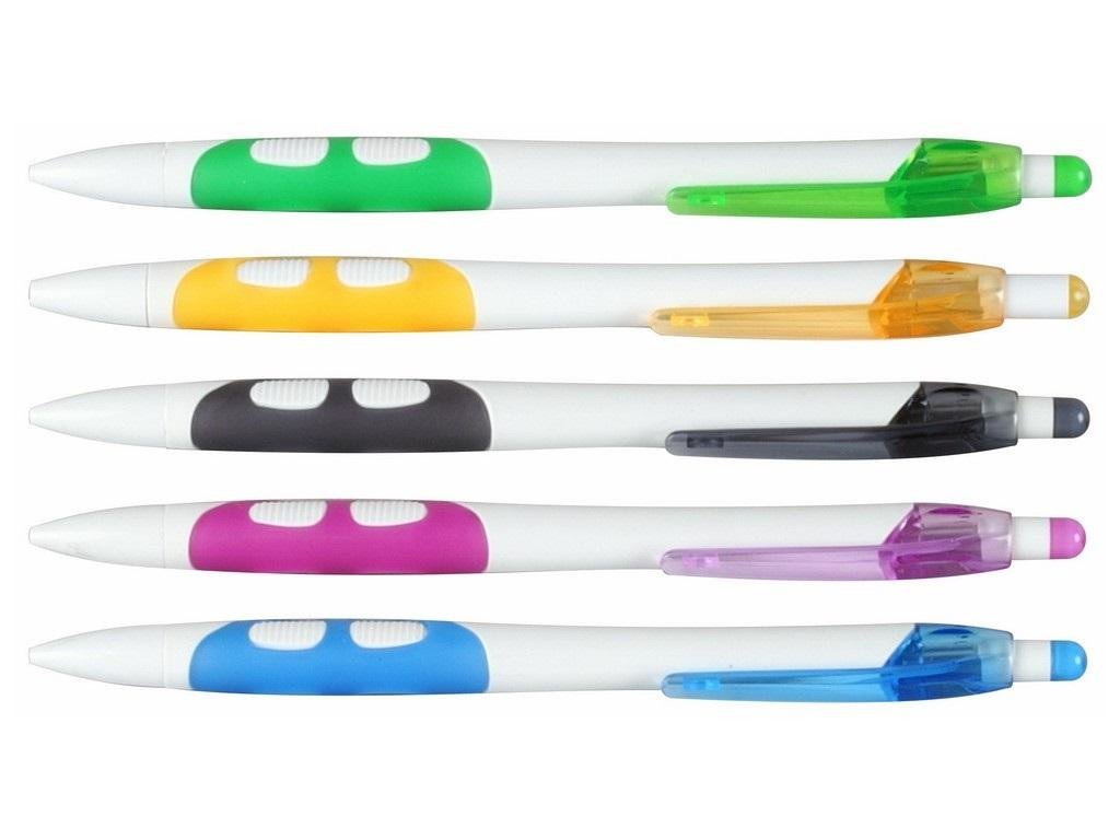 Plastikowy długopis, automatyczny, ergonomiczna obudowa z uchwytem antypoślizgowym, wymienny wkład F-411, grubość linii 0,5 mm, miks kolorów w opakowaniu zbiorczym. przeczytaj całość