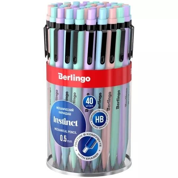 Ołówek automatyczny Berlingo "Instinct", 0,5 mm, jest doskonałym dodatkiem do bardzo popularnej serii produktów. Korpus z miękką w dotyku powłoką wykonany jest w czterech stylowych pastelowych kolorach, idealnie połączonych z czarnym metalowym klipsem. Grafit o najpopularniejszej średnicy 0,5 mm. Ołówek posiada budowaną gumkę. Mechanizm prowadzący grafit wykonany z metalu.