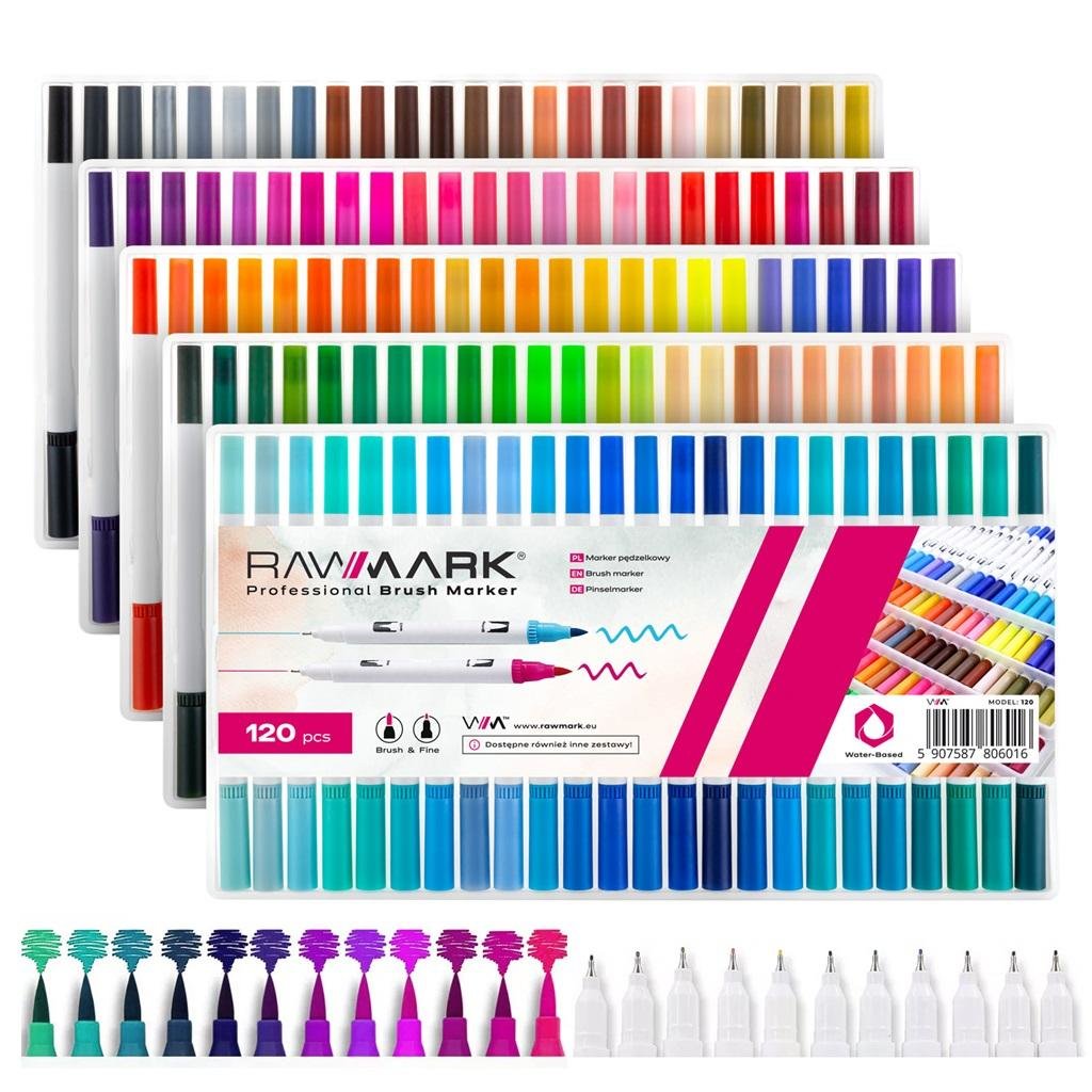 Markery dwustronne, pędzelkowe RAWMARK 120 kolorów Dwustronne profesjonalne markery z końcówką pędzelkową, które pozwolą Ci wylać swoją wyobraźnię i kreatywność na papier. Zestaw zawiera 120 markerów z dwiema końcówkami: - marker (pędzelkowy) 1-6 mm - cienkopis 0.4 mm Zestaw doskonale nadaje się...