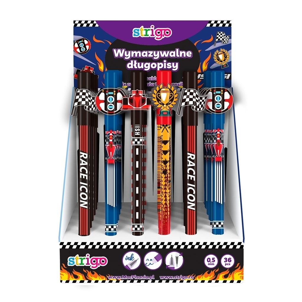 Opakowanie zbiorcze 36 sztuk.Wymazywalny długopis STRIGO ze skuwką z serii Wyścigi - Chorągiewka, Kierownica, Bolid, Puchar. Średnica końcówki piszącej 0,5 mm. W display'u 36 sztuk po 9 sztuk ze wzoru. przeczytaj całość
