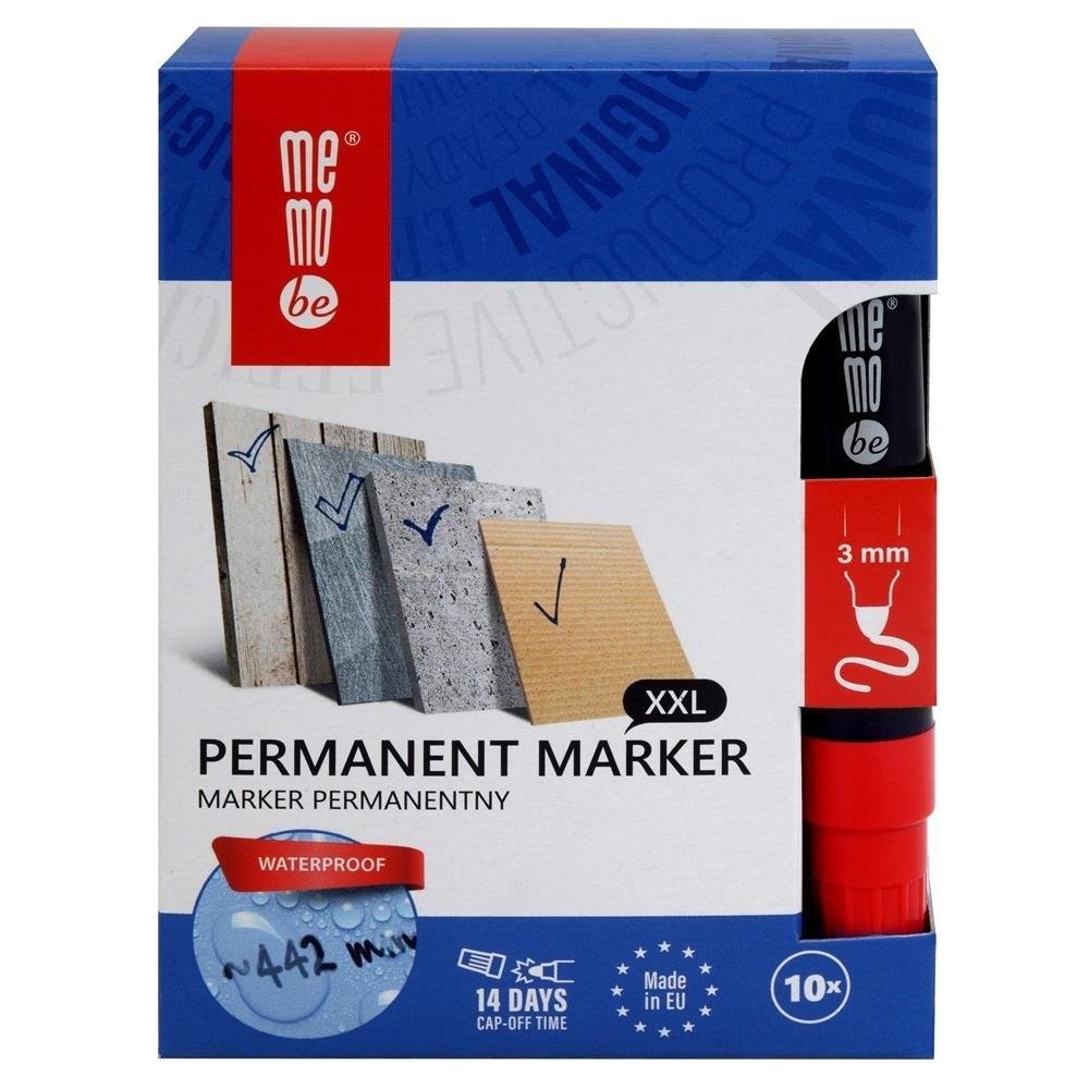 Opakowanie zbiorcze 10 sztuk.Marker permanentny MemoBe z tuszem w kolorze czerwonym i okrągłą końcówką w rozmiarze 3 mm. Przeznaczony do trwałego znakowania prawie wszystkich powierzchni, jak np.: kartonu, szkła, metalu, plastiku, drewna itd. Wodoodporny i szybkoschnący tusz o słabym zapachu....
