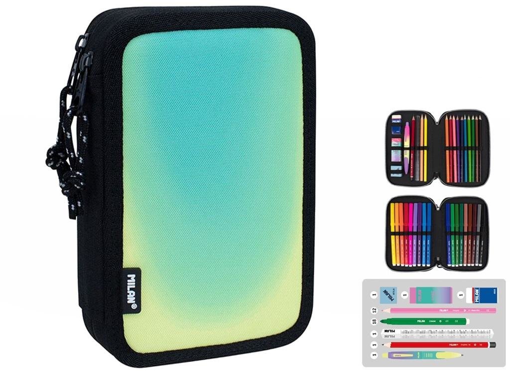 W skład wyposażenia piórnika wchodzi szeroki asortyment artykułów szkolnych renomowanej marki MILAN: ergonomiczne trójkątne kredki z drewna pochodzącego z kontrolowanych plantacji z trwałym, na całej długości przyklejonym grafitem, wytrzymałe flamastry z elastyzną stożkową końcówką na bazie wody bez szkodliwych substancji, niebieski długopis COMPACT SUNSET, klasyczny sześciokątny ołówek HB, praktyczna trójkątna linijka, bezpieczna temperówka z przymocowanym ostrzem oraz wysokiej jakości gumki z naturalnego kauczuku.