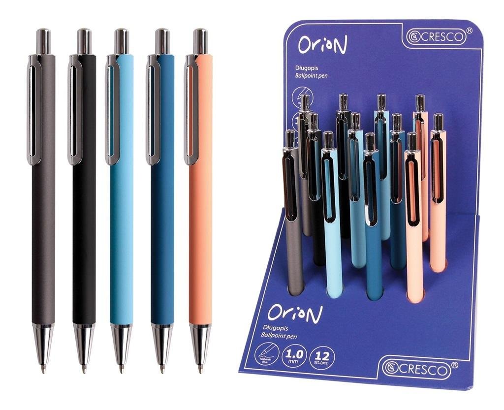 Opakowanie zbiorcze 12 sztuk.Długopis ORION to kolejna nowość CRESCO. Grubość linii pisania 1 mm. Mechanizm włączania pstrykany. Wykończenia srebrne. Korpus: powierzchnia softowa. Opakowanie zbiorcze display 12szt w mixie kolorystycznym. przeczytaj całość