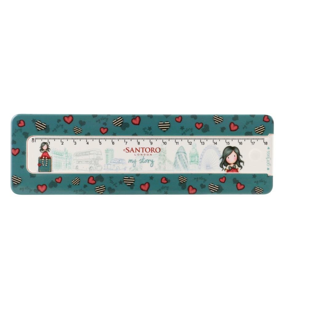 - Dodatkowo posiada w pokrywie łatwo wysuwaną linijkę, z wizerunkiem dziewczynki Gorjuss.