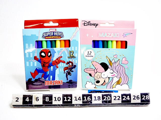Mix wzorów, towar wysyłany losowo. Różne wzory, m. in. Marvel, Disney.Mazaki - zestaw 12 intensywnych kolorów, zapakowanych w plastikowe przejrzyste etui z etykietą informacyjną i zawieszką na górze. przeczytaj całość
