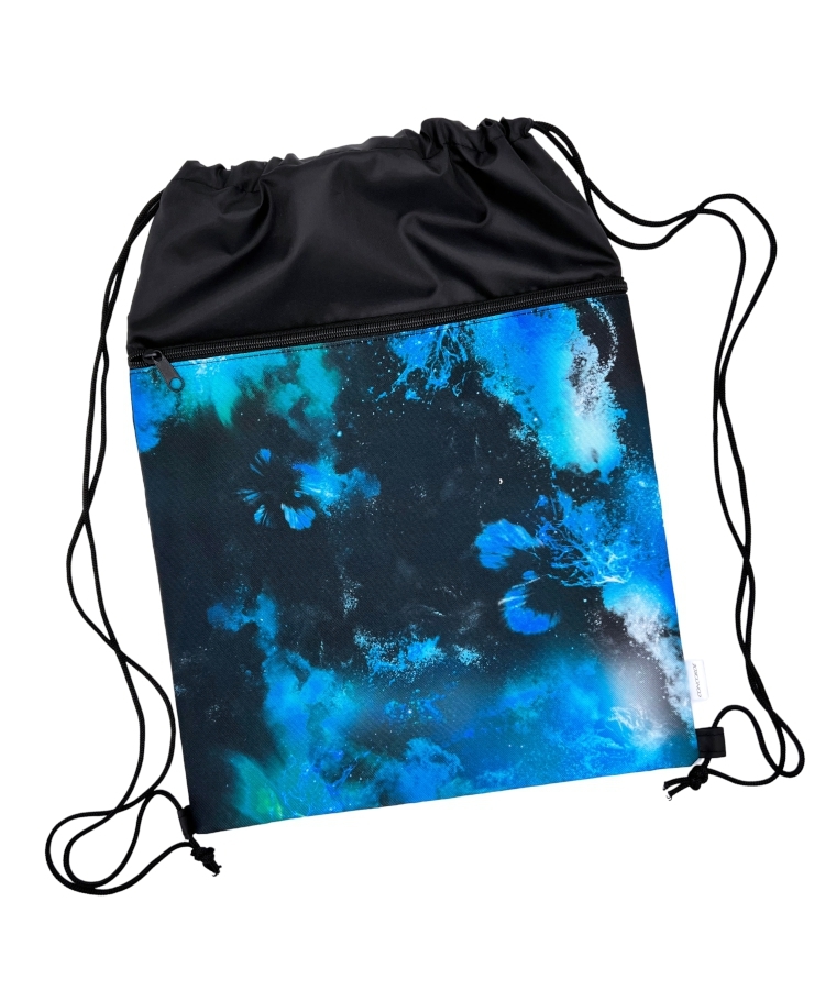 Worek na obuwie lub inne drobiazgi na zajęcia rekreacyjne lub jako lekki plecak do miasta. Zamyka się za pomocą sznurków na ramiona, które jednocześnie umożliwiają noszenie na plecach. Worek wykonano z materiału łatwego do czyszczenia w abstrakcyjnym wzorze. W komplecie praktyczna kieszonka na zamek. Zaletą worka jest bardzo niska waga. Wymiary 32,5x1x44 cm.