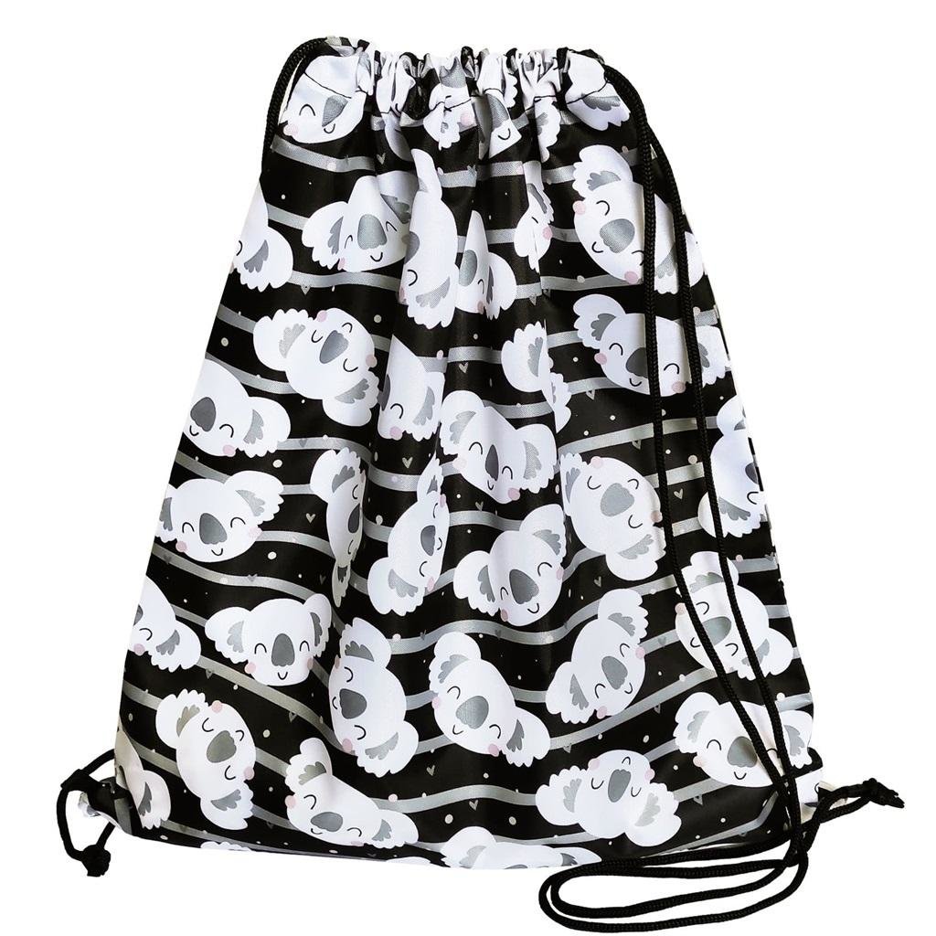Worek szkolny na obuwie zmienne z możliwością założenia na plecy ( wzór: pyszczki misiów koala na czarnym tle w białe, cienkie pasy). Wymiar 35xh40cm. przeczytaj całość