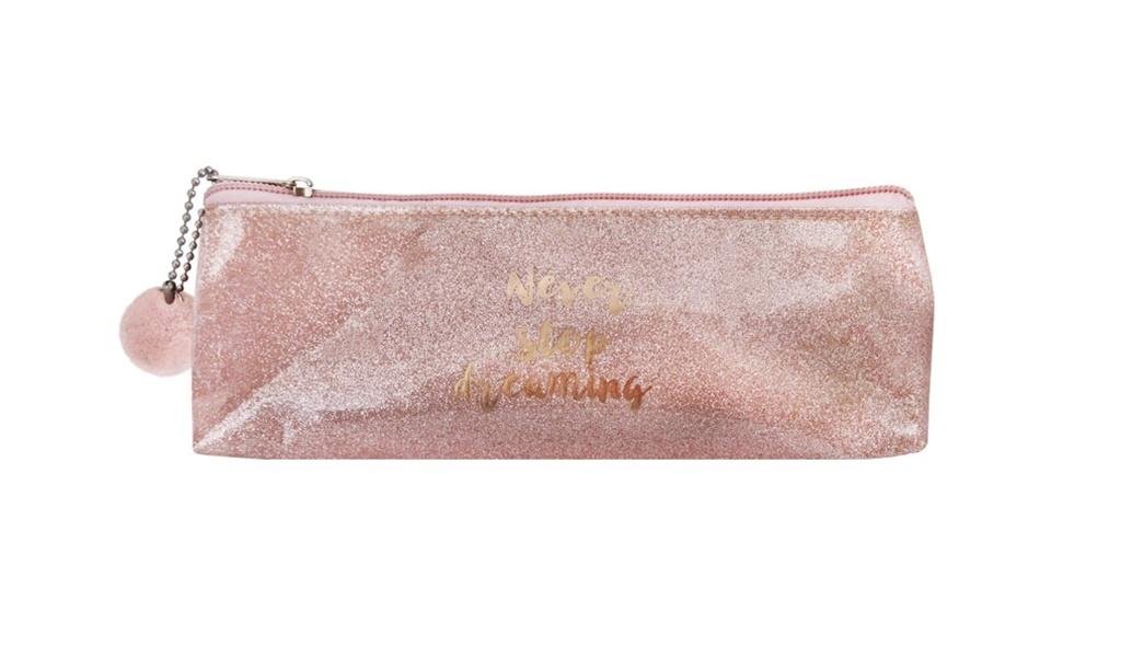 Piórnik saszetka.Zapinany na zamek.Kolor różowy, brokatowy.Ozdobiony złotym napisem. przeczytaj całość