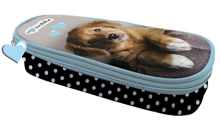 Owalny piórnik szkolny z klapką to niezbędny przedmiot uczniów. Wewnątrz na klapce znajdują się gumowe uchyty na przybory do pisania oraz skrzydło, na którym jest kieszonka z siateczki zamykana zamkiem błyskwicznym i kolejne gumowe uchwyty. Komora główna jest pojemna, korpus dodatkowo usztywniany. Na piórniku znajduje się motyw z serii The Sweet Pets z psem