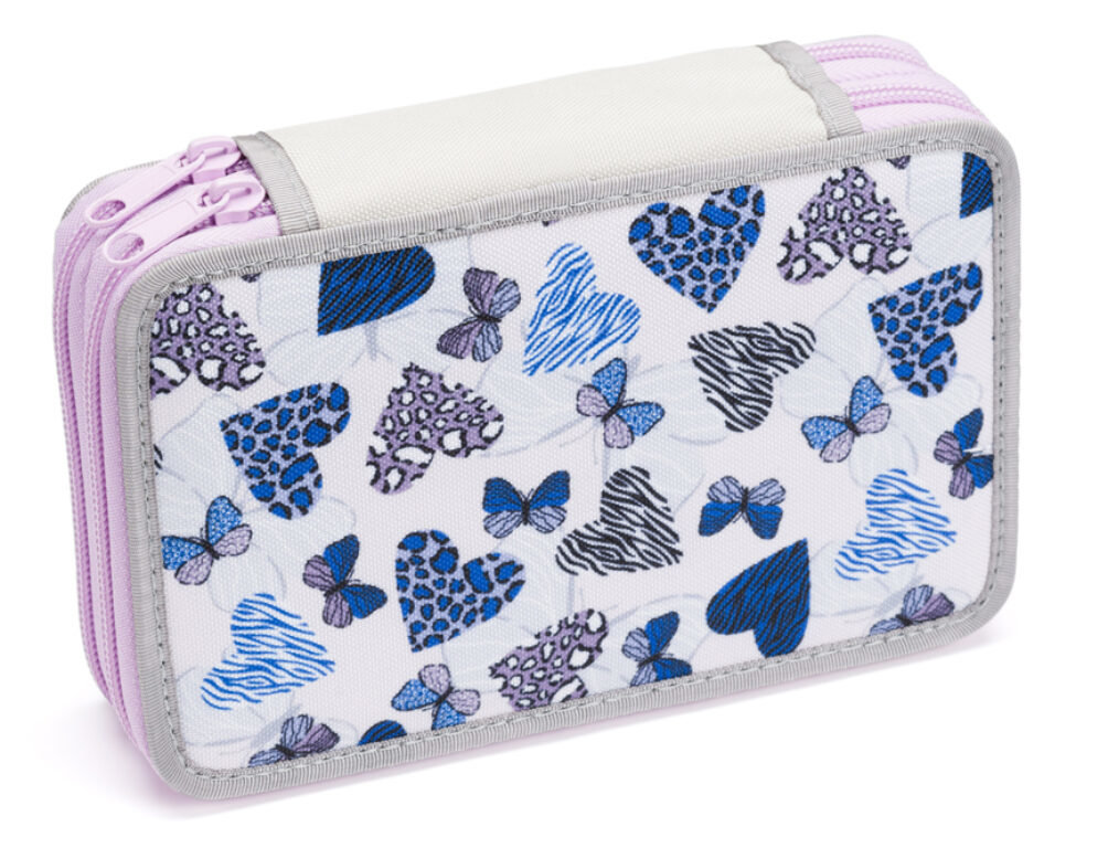 Dwupoziomowe piórniki zawierają na pierwszym poziomie 8 gumek na kredki, 2 gumeczki na ołówki i jedną większą na długopis, dalej gumki na temperówkę i gumkę oraz kieszonkę na drobiazgi, zapinaną na zatrzask.