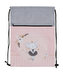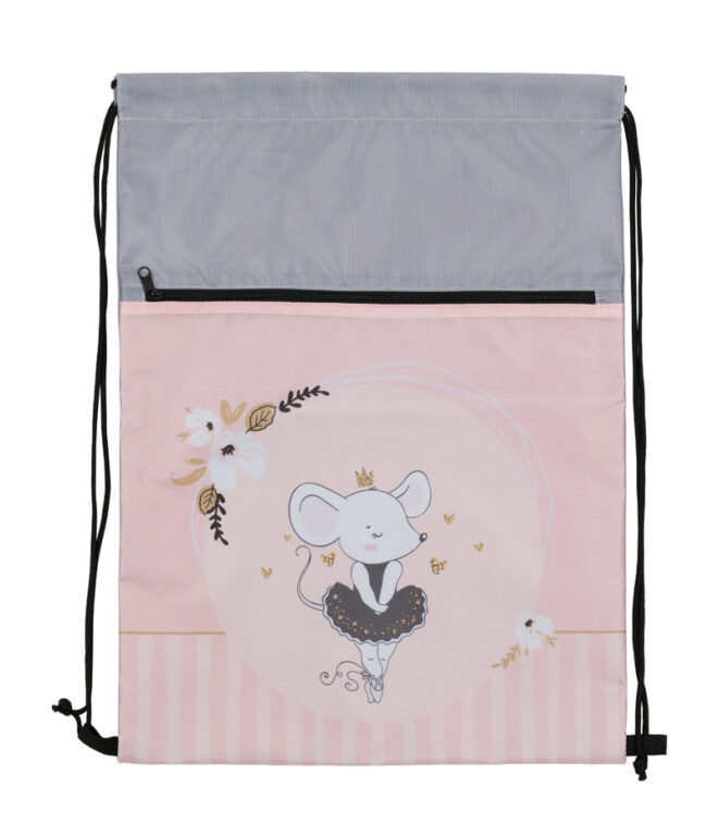 Sznurek ściągający połączony z dolną częścią zamienia worek w mały plecak na plecy.