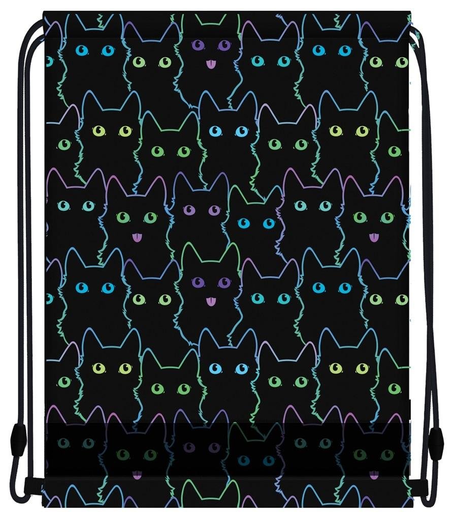 Worek szkolny Strigo z serii Koty w kolorze czarnym. Posiada dużą komorę, która zamykana jest ściągaczem, dzięki czemu w łatwy i szybki sposób mamy dostęp do jego zawartości.