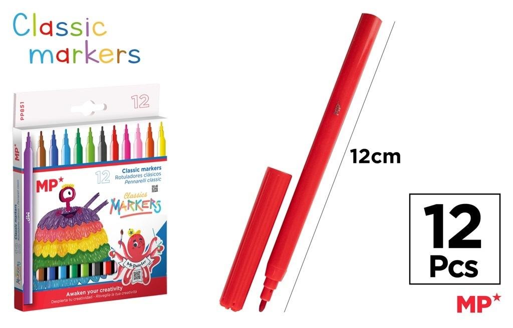 Kolorowe markery. Tusz na bazie wody. Bardzo żywe i trwałe kolory, które pobudzą dziecięcą kreatywność. Są bardzo łatwe w czyszczeniu, zarówno z rąk, jak i z większości tkanin. Średnia,stała końcówka o dużej odporności na nacisk. Pudełko 12 kolorów. przeczytaj całość