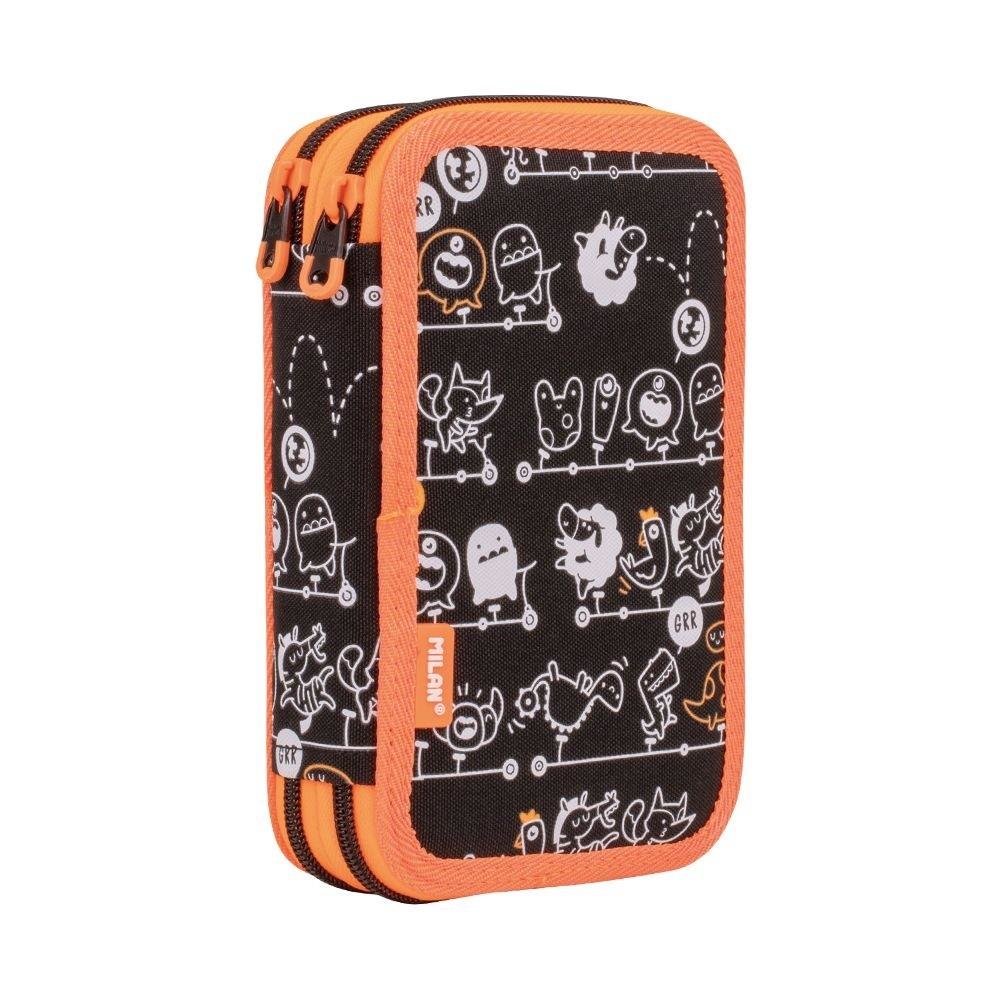 Piórnik 2 - poziomowy z wyposażeniem z kolekcji TANDEM, który pozwala utrzymać przybory szkolne zawsze w porządku i łatwo dostępne. Białe i fluo pomarańczowe nadruki na czarnym materiale przedstawiają różnorodne postacie przemierzące noc w tandemie. Dinozaury, krokodyle i kosmici, a także zabawne...