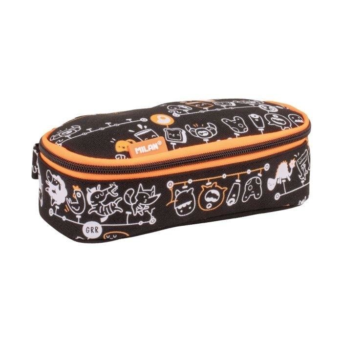 Piórnik owalny MILAN zapinany na suwak z kolekcji TANDEM. W środku dodatkowa kieszonka z siatki. Białe i fluo pomarańczowe nadruki na czarnym materiale przedstawiają różnorodne postacie przemierzące noc w tandemie. Dinozaury, krokodyle i kosmici, a także zabawne tosty, jajka i rogaliki. Wszystkie...