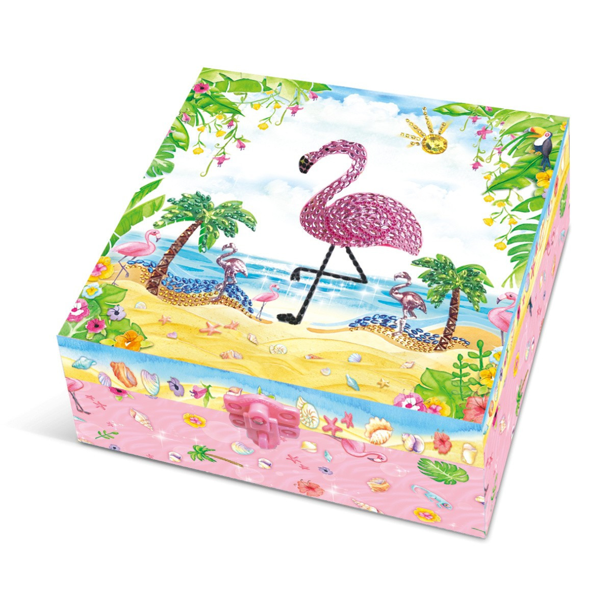 Pecoware Zestaw w pudełku z półkami FlamingZestaw zawiera: Mini pamiętnik z kolorowymi kartkami zamykany na zamek Długopis w 4 kolorach Duże kryształki w różnych kształtach i kolorach Zestaw naklejek (małe i duże + arkusz) Naklejkę 3D Maleńkie koraliki Papierowe spinacze Ozdobną kokardę Zestaw...