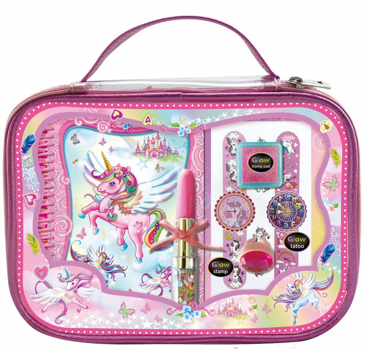 Mini pamiętnik na spirali z kolorowymi kartkami (120 kartek) Długopis ozdobiony brokatem i kokardką Pieczątkę w kształcie pierścionka Gąbeczkę na tusz Arkusz z tatuażami świecącymi w ciemności Zapakowany w ozdobną przezroczystą kosmetyczkę z brokatowym bokiem idealnie nadającą się na prezent. przeczytaj całość