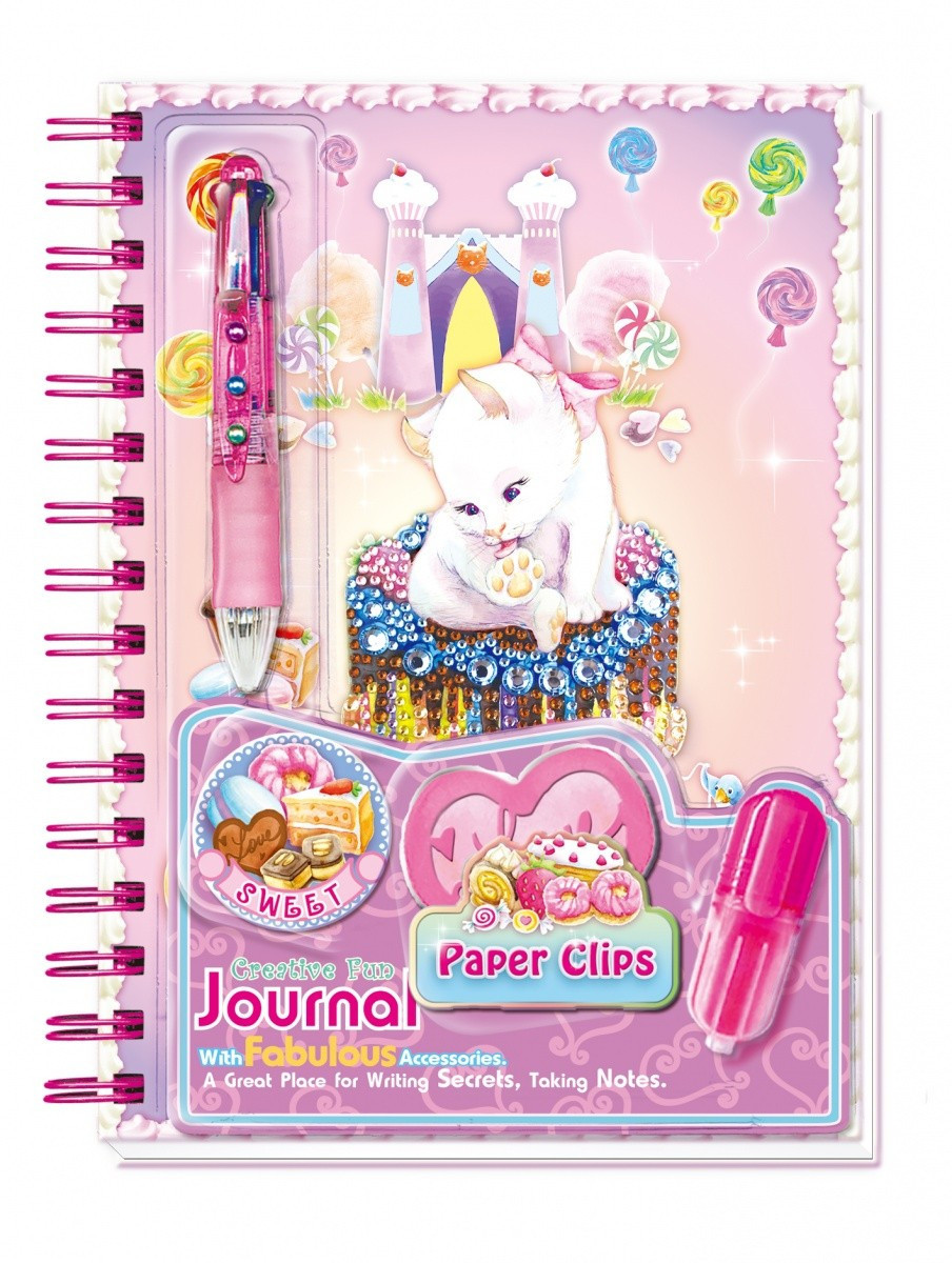 Zestaw zawiera: Pamiętnik na spirali z kolorowymi kartkami Długopis w 4 kolorach Naklejki 3D Kolorowe papierowe spinacze 1 zakreślacz Wszystkie akcesoria zapakowane są w dodatkowym opakowaniu doczepionym do spirali dzięki czemu nigdy się nie zgubią. przeczytaj całość