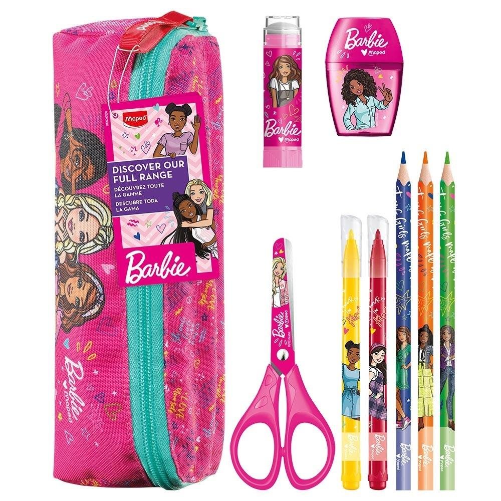 Piórnik Barbie z akcesoriami do pokolorowania MapedZawartość: piórnik, nożyczki, gumka, temperówka, 3 kredki i 2 flamastry.JS.: 1 etui. przeczytaj całość