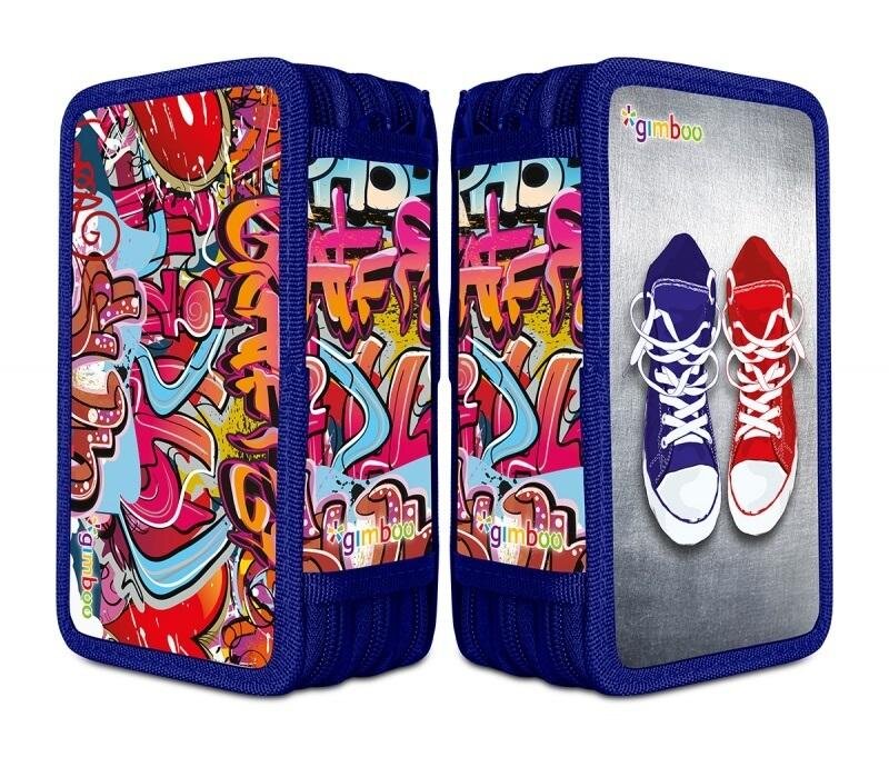 piórnik szkolny z kolekcji GIMBOO 2024 posiada 3 komory zestaw zawiera wyposażenie (linijkę, ekierkę, 3 szt. długopisów, ołówek, gumkę, temperówkę, 16 szt. flamastrów, 16 szt. kredek) przeczytaj całość