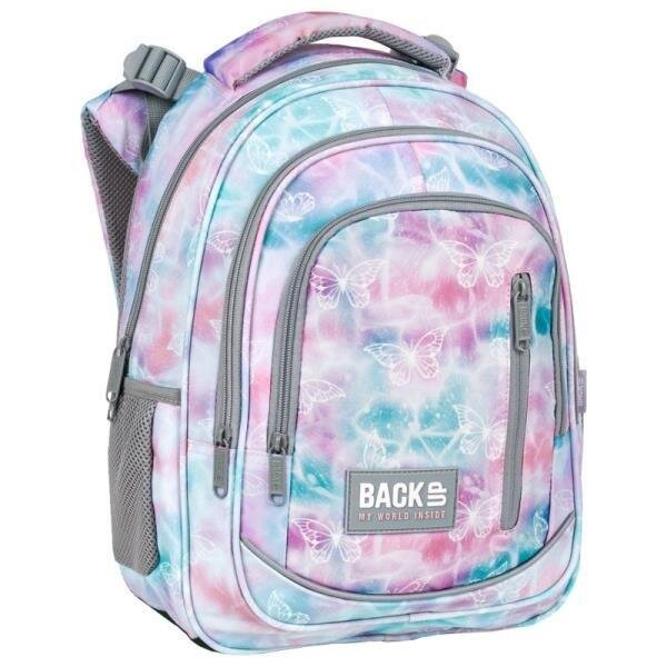 Plecak BackUp 6 R10 Bajkowe motyle DERFORMMotyle na bajkowym, pastelowym tle - to plecak dla dziewczynki, która jest prawdziwą marzycielką. Romantyczne połączenie delikatnych barw różu, fioletu i turkusu przeplata się z pasmami świetlistej bieli. Szare elementy suwaków i zamków dopełniają...