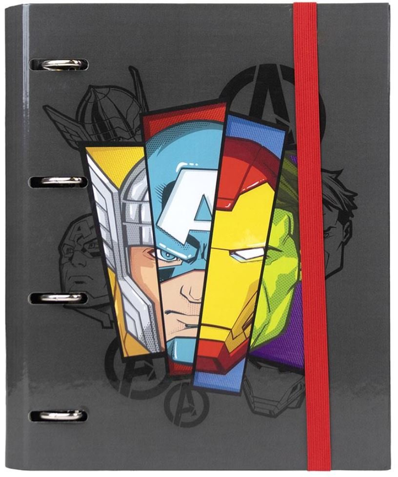 Kroužkový pořadač se 4 kroužky a motivem superhrdinů Avengers od společnosti Marvel.