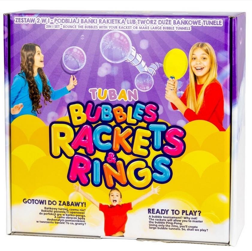 BAŃKOWE RAKIETKI I OBRĘCZE Zestaw zawiera: słomkę do dmuchania baniek, płyn do baniek 250 ml, talerzyk, 2x materiałowa nakładka na obręcz, 2x obręcz. Wiek 3+ przeczytaj całość